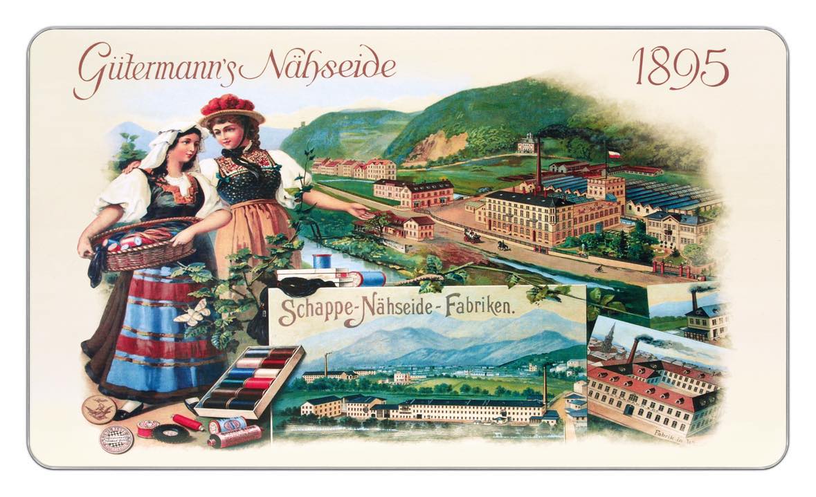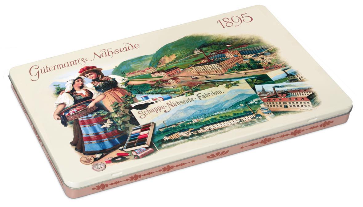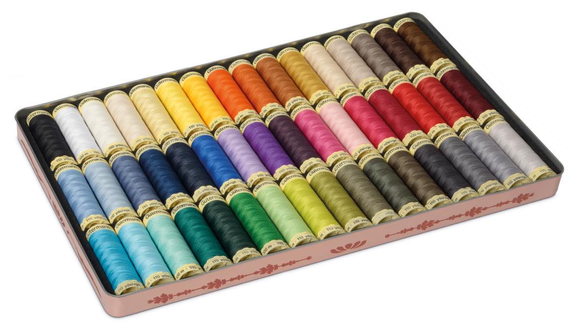 Förvaringsbox med nostalgiskt motiv innehållande 48 st trådrullar "Alla tygers tråd 100 m" i olika färger. Gütermann 100 meters polyestertråd är utmärkt lämpad för både symaskin-, overlock- och handsömnad, oavsett typ av söm. Tvättbar upp till 95 grader. Symaskinsnål: Standard 70-90