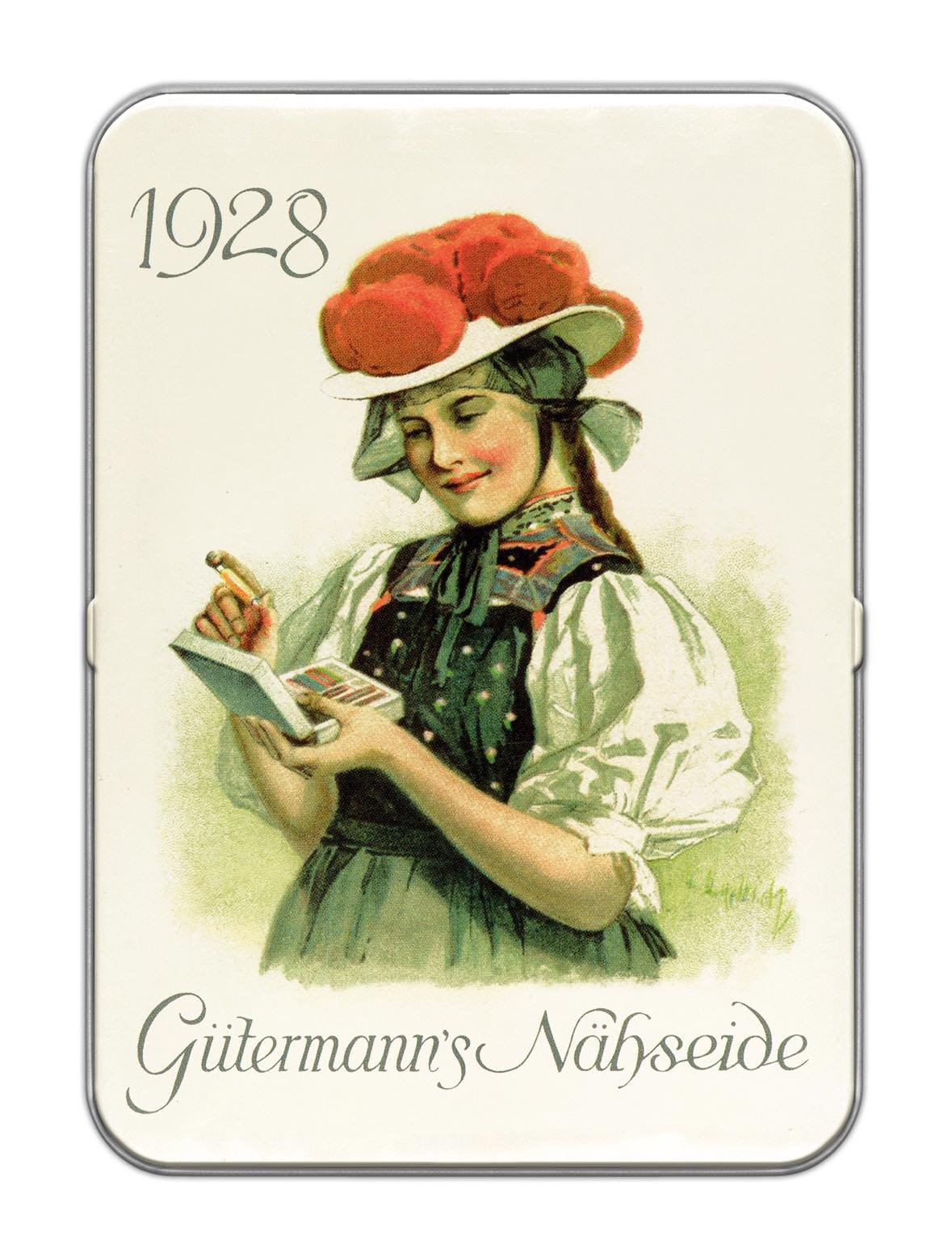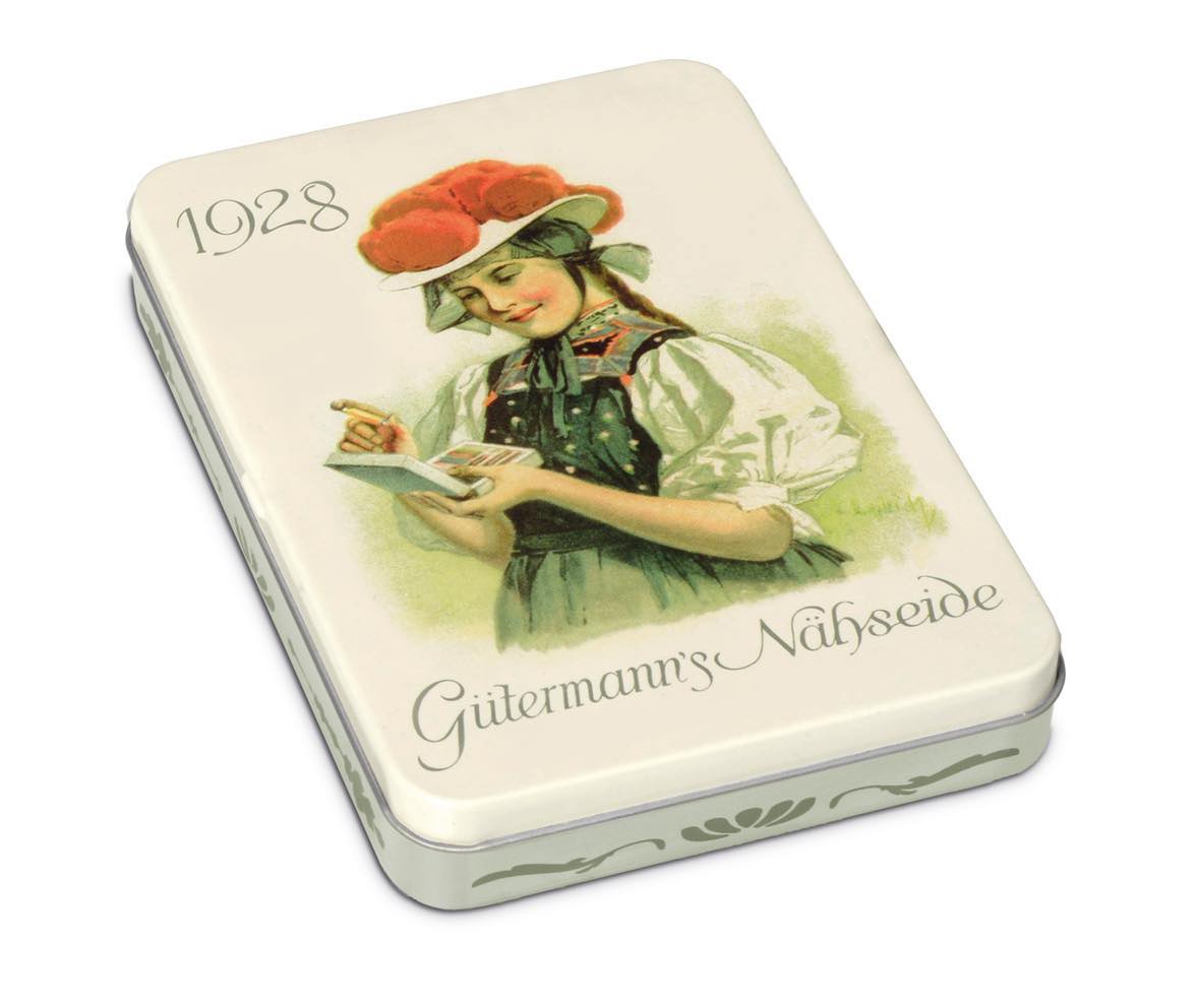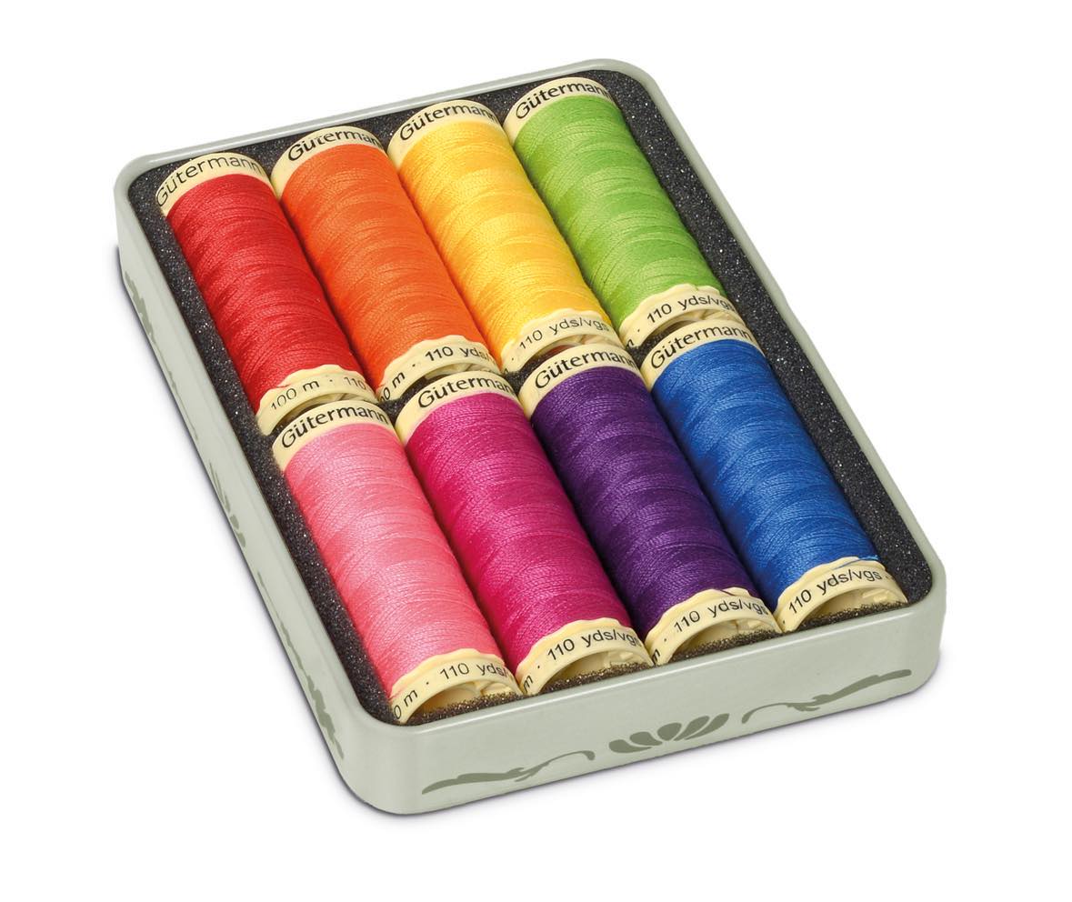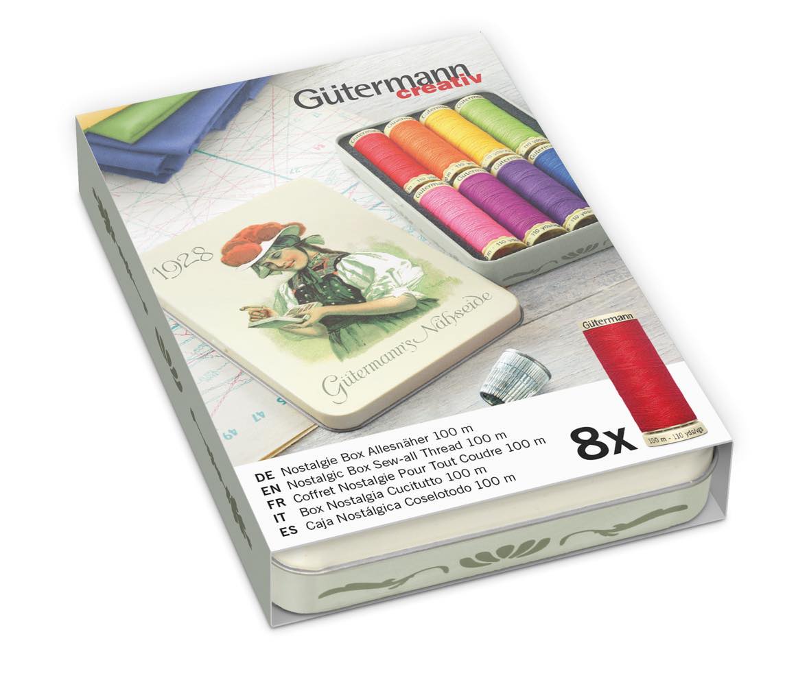 Förvaringsbox med nostalgiskt motiv innehållande 8 st trådrullar "Alla tygers tråd 100 m" i olika färger. Gütermann 100 meters polyestertråd är utmärkt lämpad för både symaskin-, overlock- och handsömnad, oavsett typ av söm. Tvättbar upp till 95 grader. Symaskinsnål: Standard 70-90