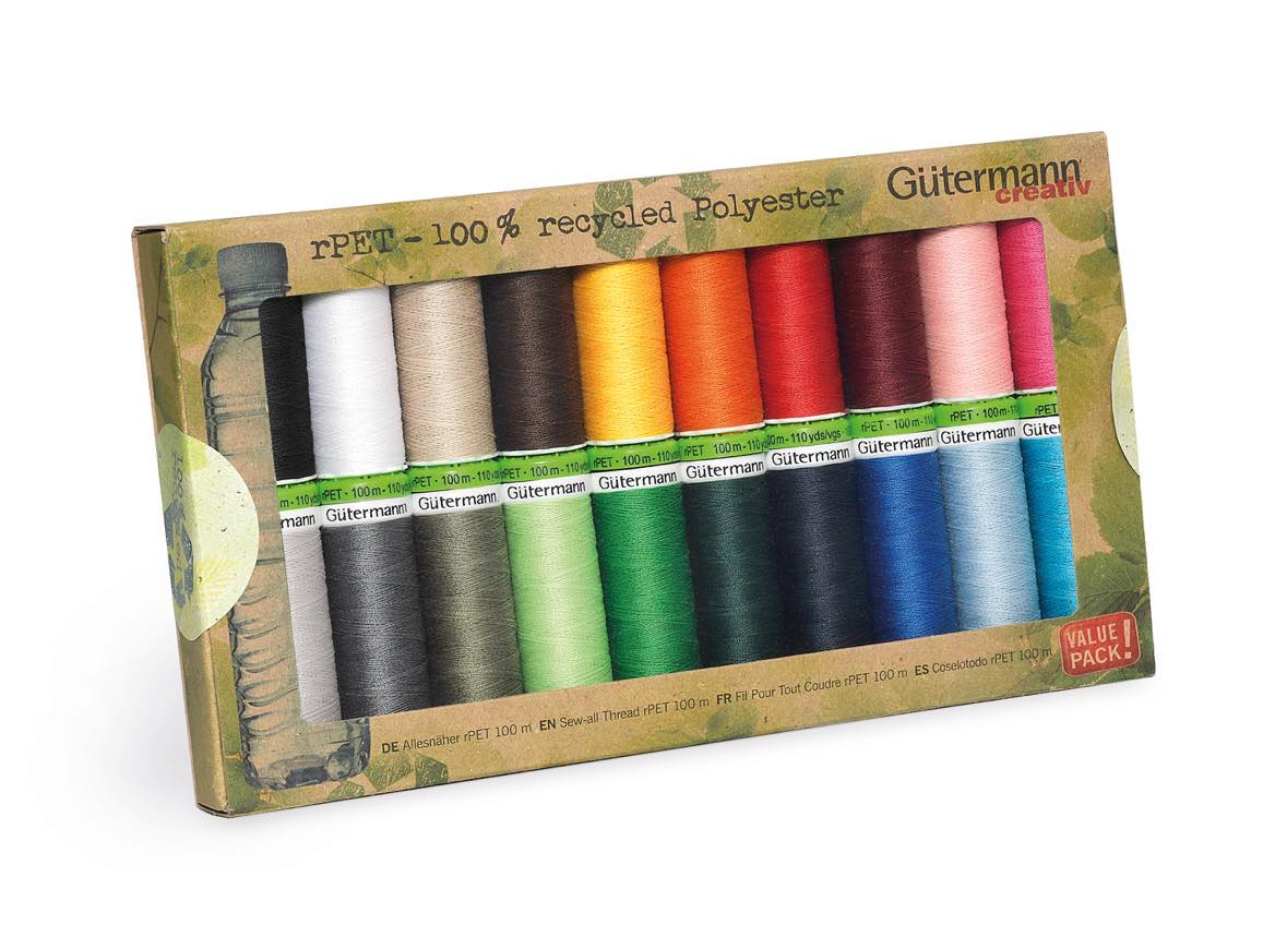 Trådset innehållande 20 st trådrullar Alla tygers tråd rPet i de populäraste färgerna. Gütermann 100 meters rPET tråd tillverkas till 100% av återvunna PET-flaskor och är utmärkt lämpad för både symaskin-, overlock- och handsömnad, oavsett typ av söm. Tvättbar upp till 95 grader. Symaskinsnål: Standard NM 80-90
