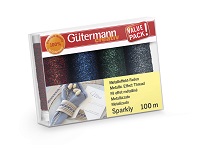 Trådset innehållande 4 st trådrullar 100 meters Sparkly i olika färger. Gütermann Sparkly 100 meter har en trendig metalllook. Den garanterar gnistrande effektsömmar och utsmyckningar för accessoarer, kläder eller trendiga dekorationer. Tack vare sin tvåfärgade look är den ett riktigt blickfång på tyg såväl som på många andra material. Enskild dekorativa sömmar och dekorativa sömmar ser särskilt eleganta och sofistikerade ut. Symaskinsnål: Universal NM 100-110