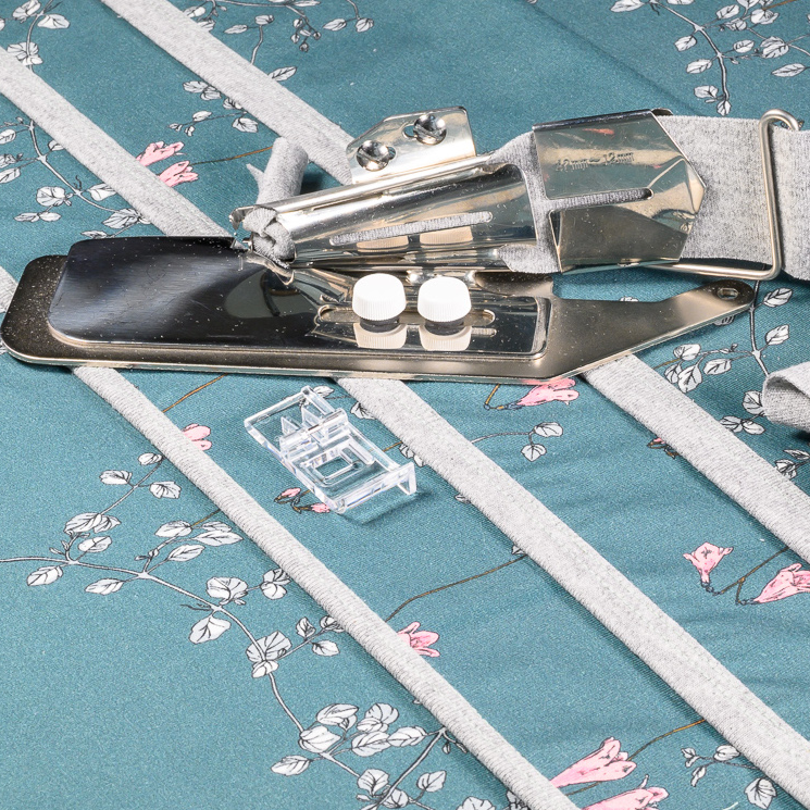 Använd bandkantaren att sätta kantband.Tygremsan viks och hålls på plats av guiden.Du kan även använda den här foten för att sy passpoalband.