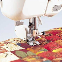 Matarna på foten förflyttar sig i samma takt som de undre matarna på maskinen så att tyget matas jämt. Tyger som kan vara svåra att sy, t.ex. vinyl, läder, kviltningslager och sammet kan lätt sys. Använd den stängda övermataren för tjocka tyglager och den öppna övermataren när du vill se bättre.