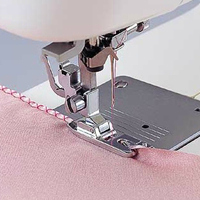 1. Öka övertrådens spänning. 2. Placera tyget med avigsidan uppåt under pressarfoten. 3. Sänk ner pressarfoten i tyget ca 3,2mm (1/8") från kanten och sy 2-3 stygn. 4. Höj nålen och pressarfoten. 5. Vik tyget från baksidan och framåt och rulla in det i den vridna delen på foten. 6. Positionera tygets kant bakom nålen och sänk pressarfoten. 7. Sy sakta 2-3 stygn och kontrollera att tyget rullas runt den vridna delen på foten. 8. Fortsätt att sy till tygets ände.