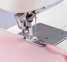 1. Placera tyget med avigsidan uppåt under pressarfoten. 2. Sänk ner pressarfoten i tyget ca. 3,2 mm (1/8") från kanten och sy 2-3 stygn. 3. Höj nålen och pressarfoten. 4. Vik tyget från baksidan och framåt och rulla in det i den vridna delen på foten. 5. Positionera tygets kant bakom nålen och sänk pressarfoten. 6. Sy sakta 2-3 stygn och kontrollera att tyget rullas runt den vridna delen på foten. 7. Fortsätt att sy till tygets ände.