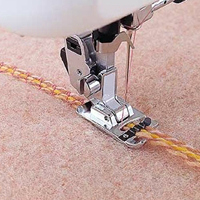 1. För in en snodd från höger på pressarfoten och placera snoddarna i ledarna, (använd mittledaren om du bara har en snodd). 2. Placera snoddarna under pressarfoten och välj en sick-sacksöm med maximal stygnbredd.