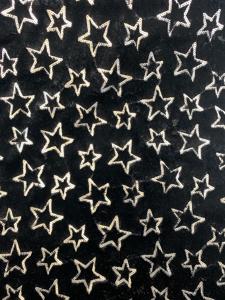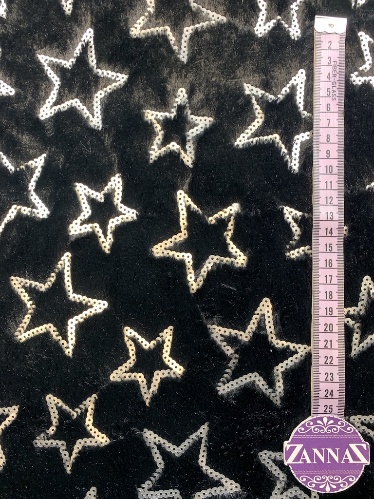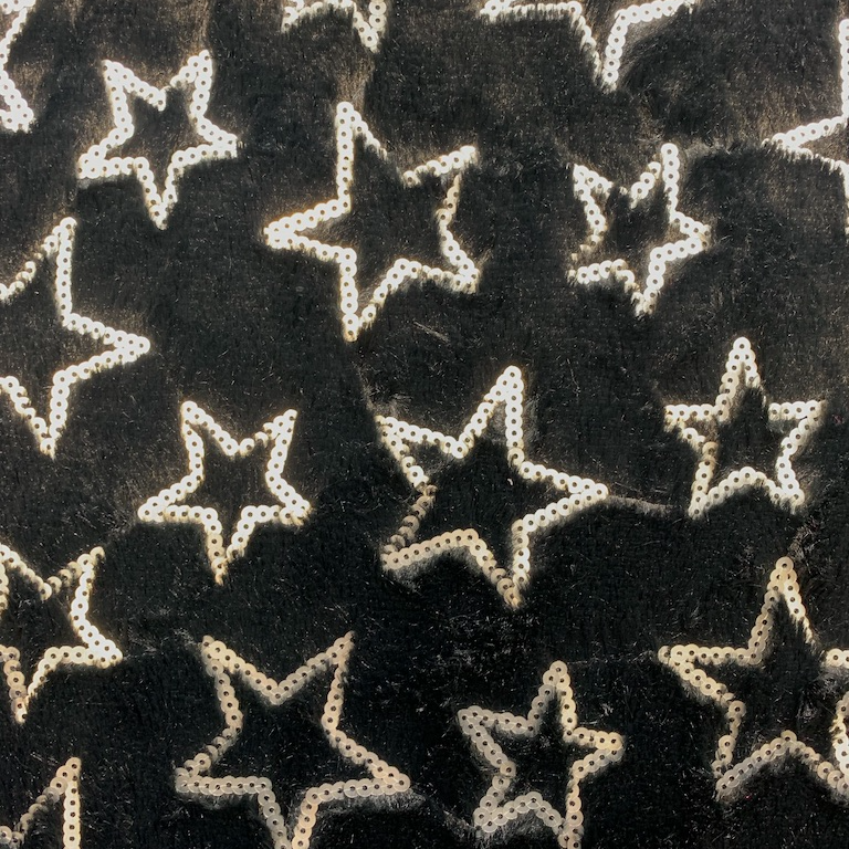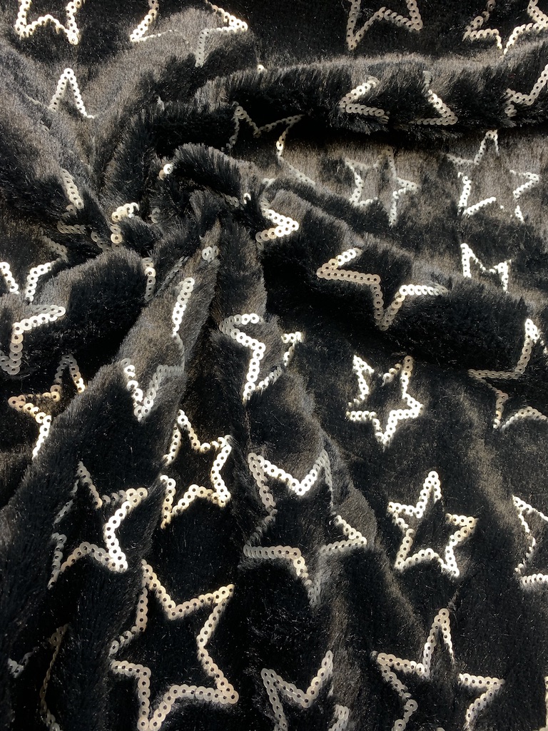 Tyg med lång lugg som ser pälsaktig ut med paljett stjärnor.