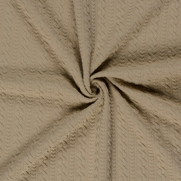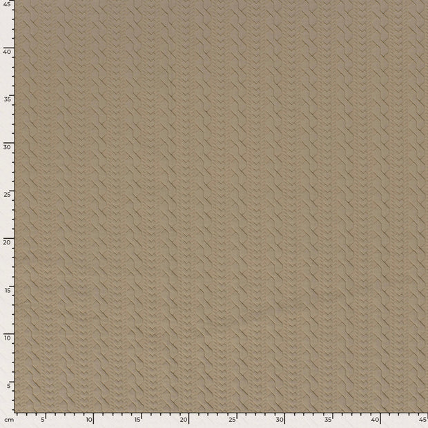 Mjuk trikåtyg med kabelstickat mönster på rätsidan och en slät avigsida..