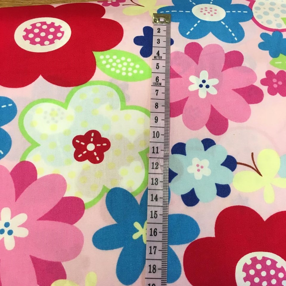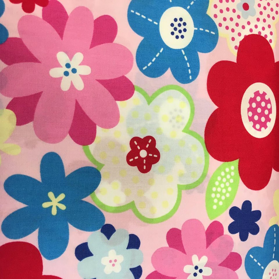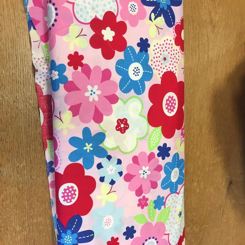 Blommor i olika färger på ljusrosa botten 16,9kr - pris avser per dm.