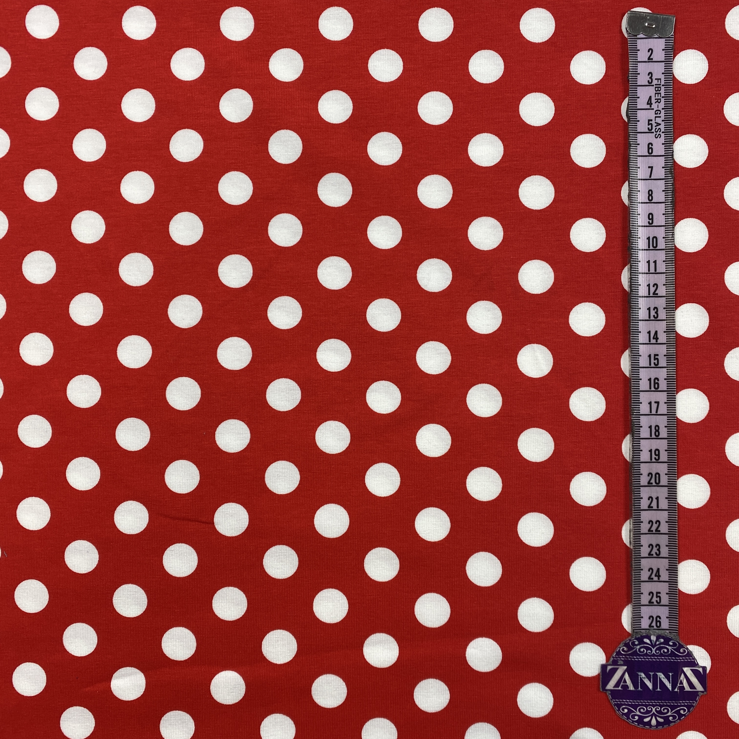 Röd, stora vita prickar - Trikåtyg
