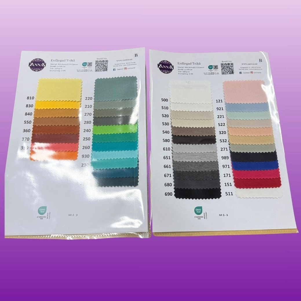Nu blir det enklare än någonsin att matcha! Med vår färgkarta får du en tydlig överblick av våra 60 mest omtyckta nyanser – perfekt när du vill se hur färgerna ser ut i verkligheten och hitta den rätta tonen till dina tyger där hemma.
