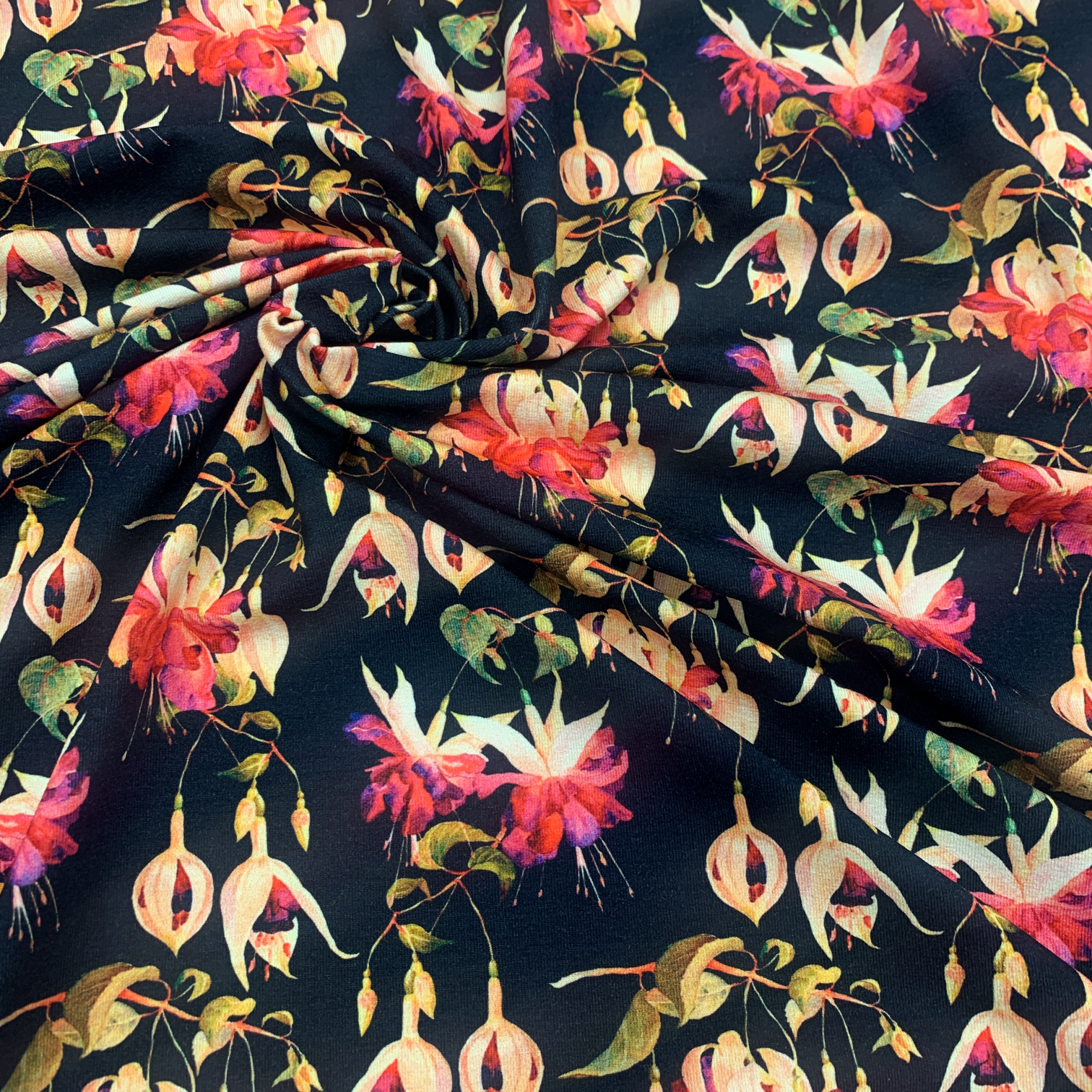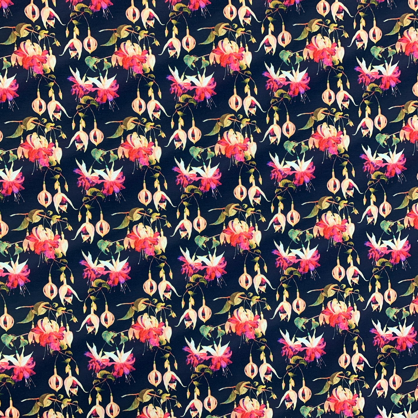 Egenproducerat viskosjersey med motiv av Fuchsia.