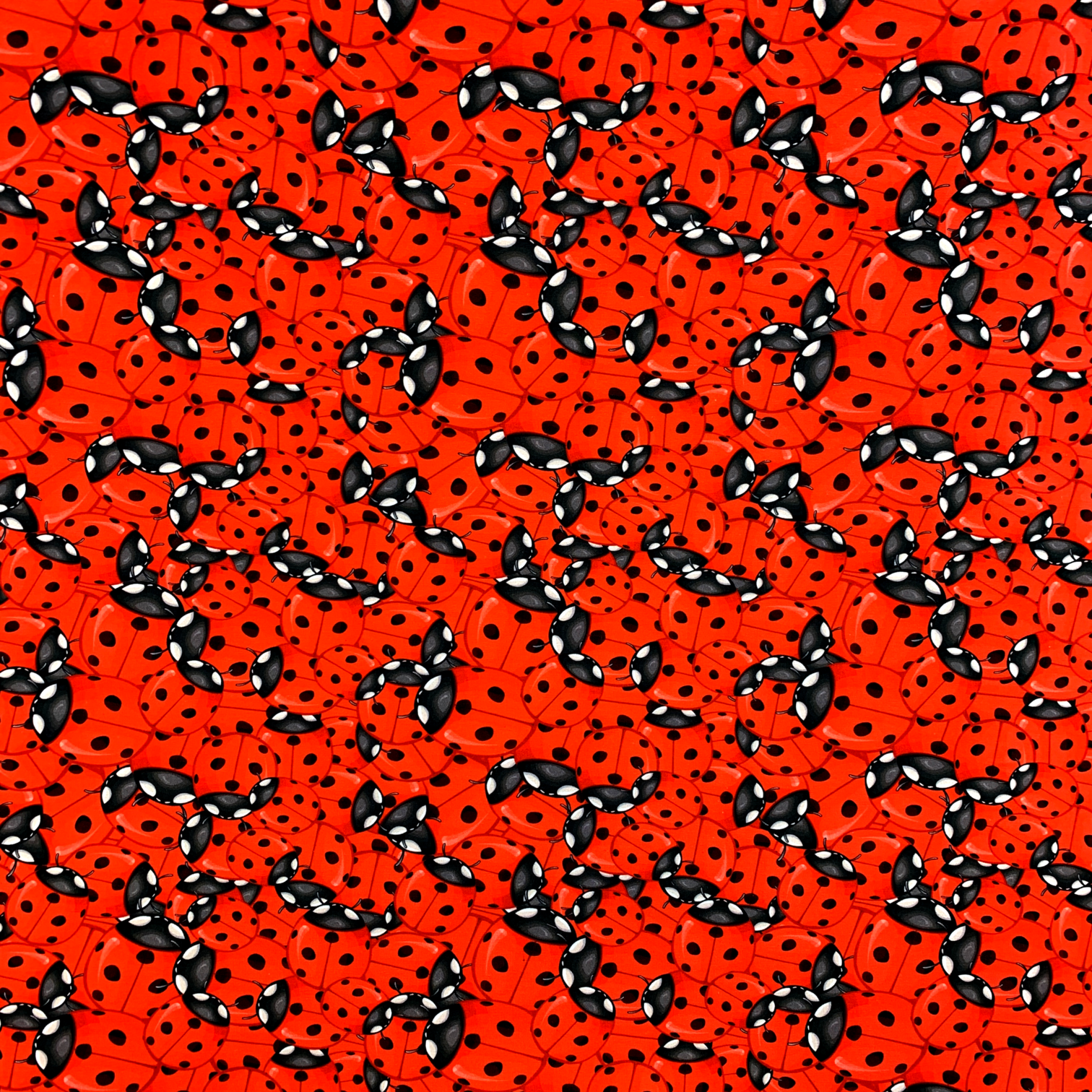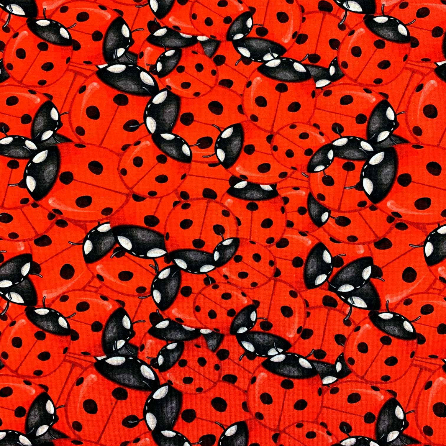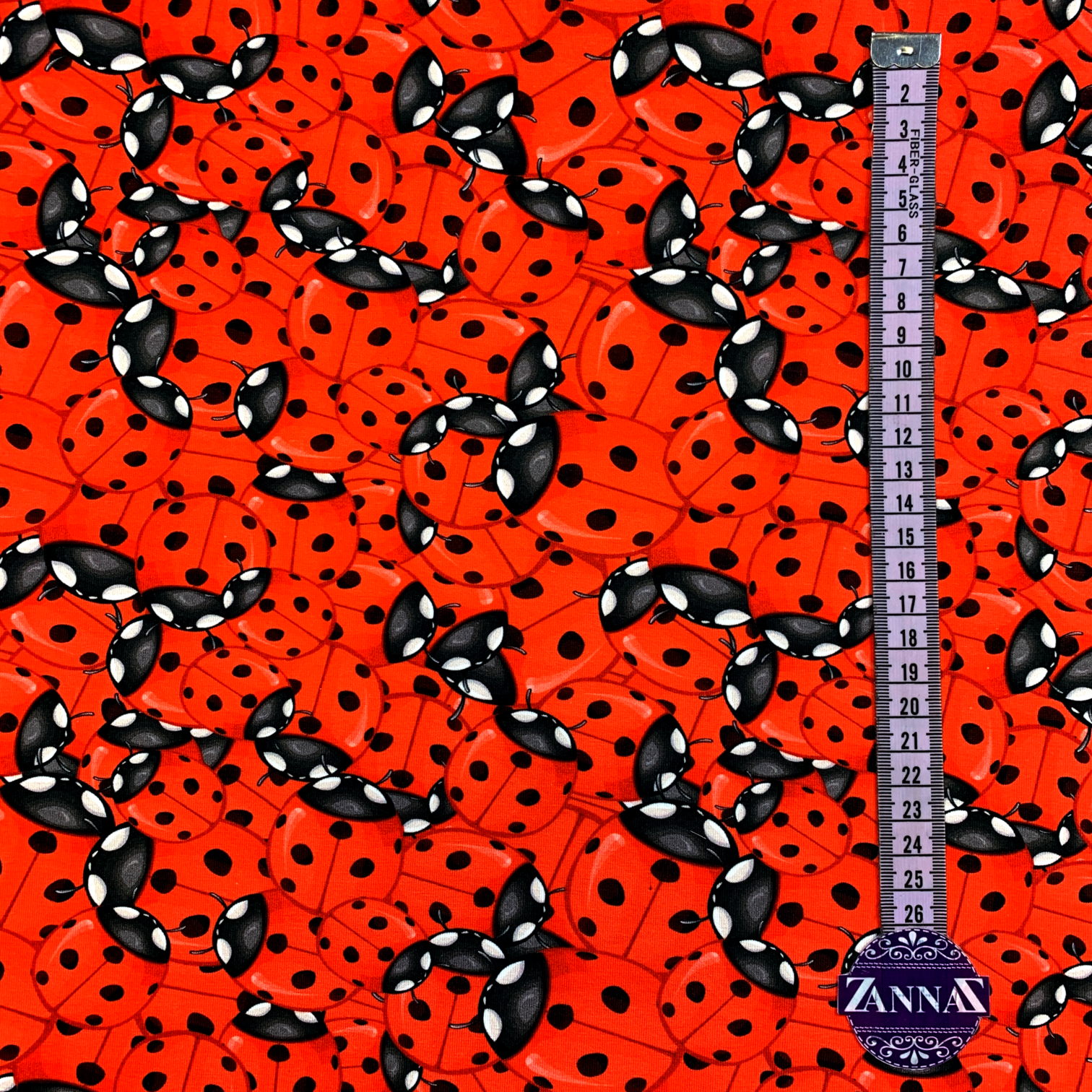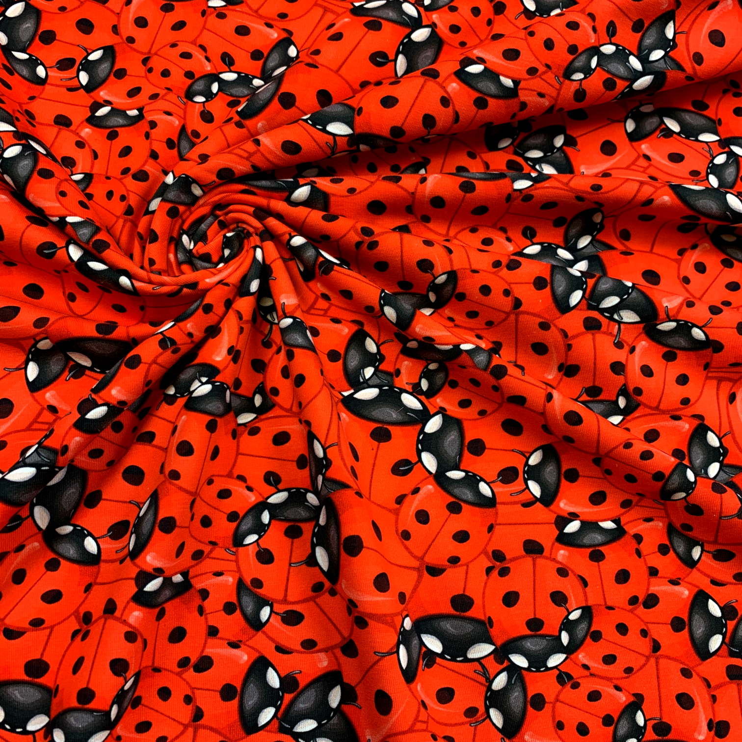Egenproducerat trikåtyg med motiv av nyckelpigor.