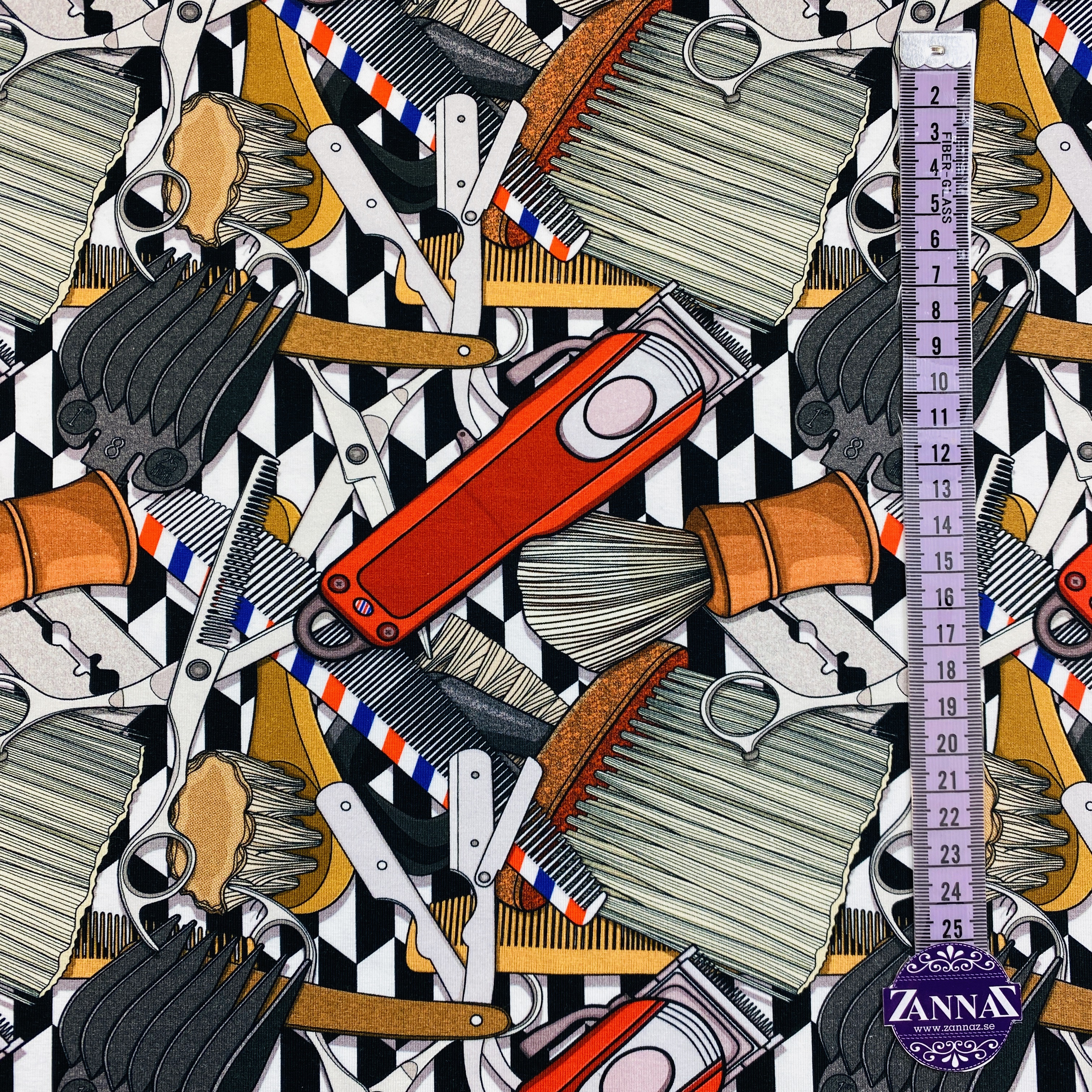 Egenproducerat trikåtyg med motiv av barberare verktyg.