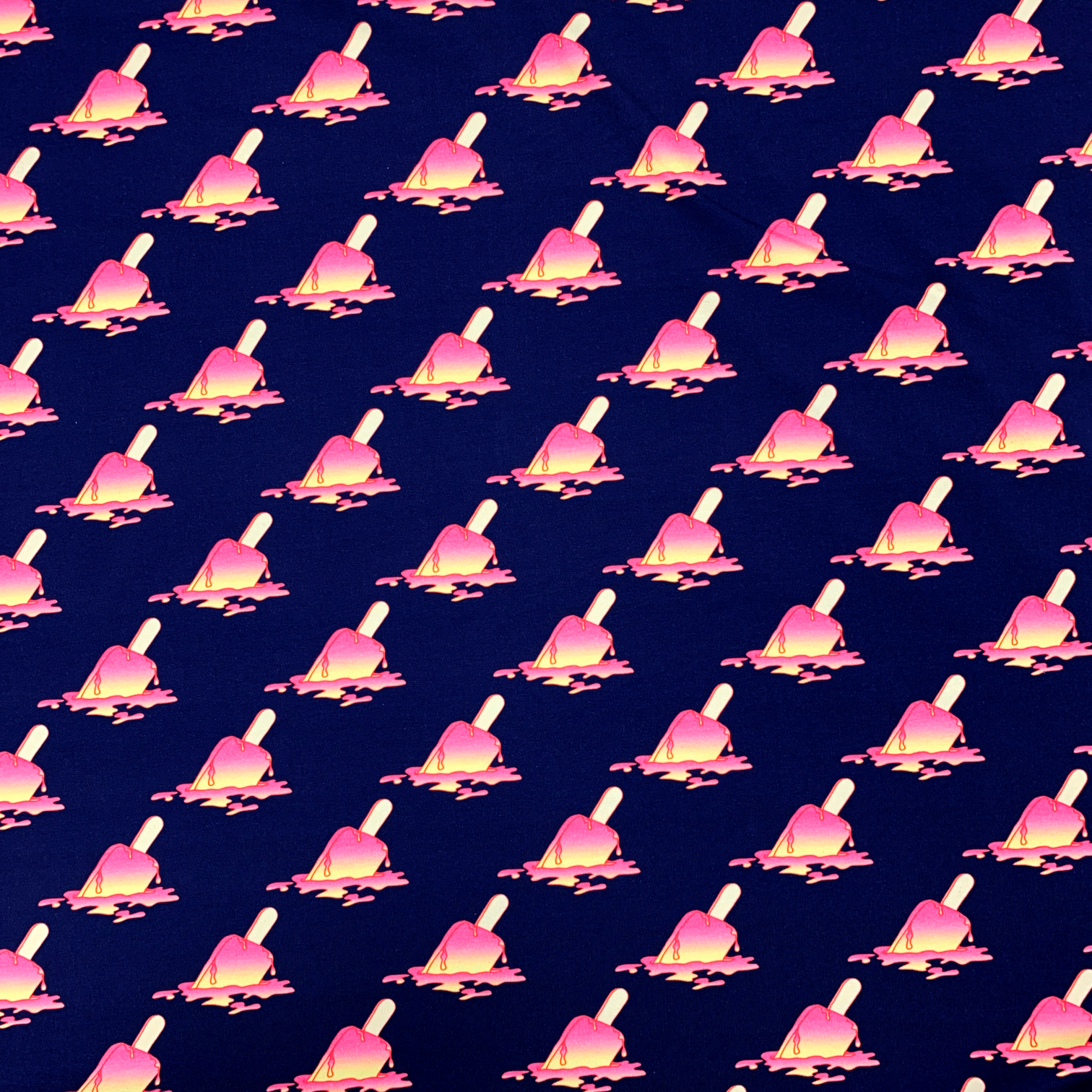 Egenproducerat trikåtyg med motiv av smältande glass.